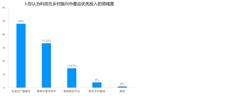 团队通过网上平台发放调查问卷,深入了解了不同地区、不同人群对科技赋能乡村振兴的认知、态度和期望。结果显示,受访者普遍认为现代科技对乡村振兴具有重要作用,但对具体应用场景的了解仍有限,说明具体的实现路径仍需进一步探索。同时,整体投入偏向市场化应用,基础性、社会性科技应用发展相对滞后。此外,受访者对科技赋能乡村振兴带来的生活方式、生产效率等方面的提升有明显感知,但也指出科技普及范围与应用深度仍有不足。这些调查结果为后续深入研究科技赋能乡村振兴的现状与问题、提出针对性的发展建议提供了重要支撑。