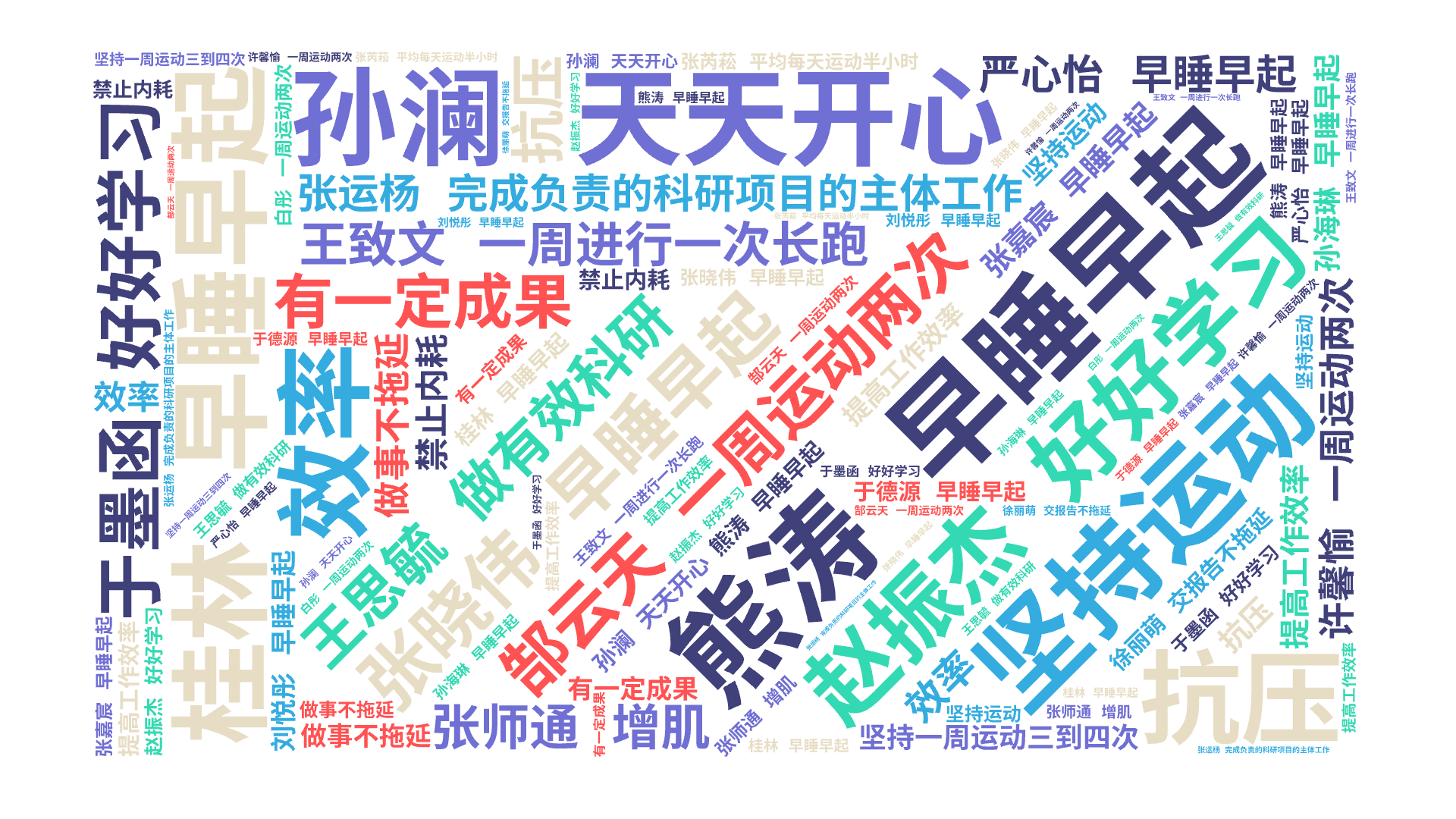 支部对全体成员本学期的“改进目标”进行了统计:其中“早睡早起”被提及8次,规律运动”7次,“提升工作效率”5次。健康作息与运动相关目标合计约占75%,充分表明在当前科研压力下,同学们对身心平衡的迫切需求;提高工作效率类目标约占25%,显示“高效科研、成果导向”已成为支部的共同追求。为帮助大家将目标落到实处,支部推出多项举措:每晚24点后自动推送“熄灯提醒”,开展“晒灯”互评激励;依托跑步或健身App进行周度数据结算,建立“运动积分榜”等。支部委员已为每位同学建立目标档案,后续将通过月度小结与线上打卡持续跟进,确保目标落地见效。