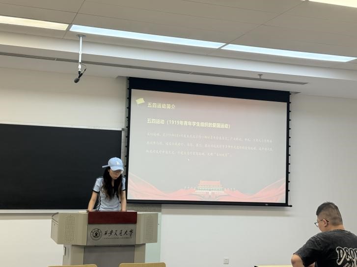团支书刘佳潼首先以“五四运动的历史回响与当代启示”为切入点,通过历史影像、文献摘录与互动问答,系统梳理五四精神的几个核心内涵,结合《新时代青年要勇担民族复兴重任》讲话,团支书强调“五四精神是跨越百年的青春密码”,号召支部成员“在科技创新、乡村振兴、国际竞争中争当先锋,将个人理想融入强国伟业”。