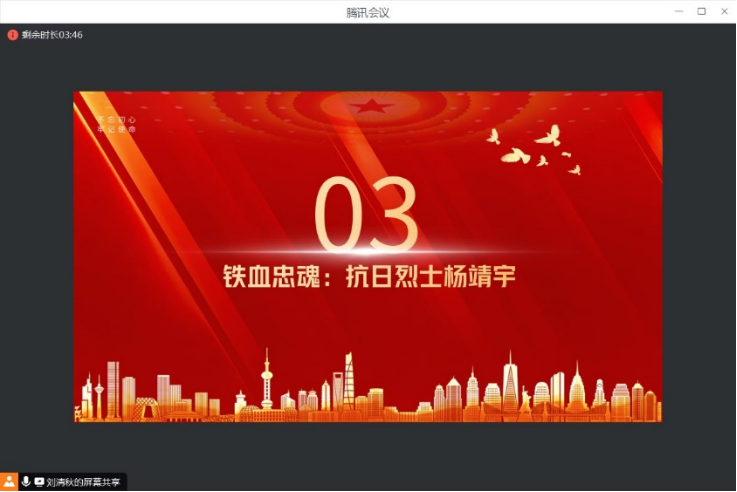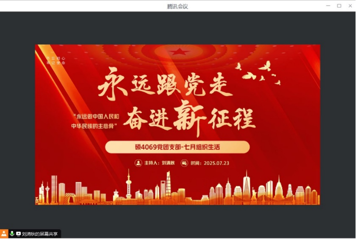 为弘扬伟大建党精神和抗战精神,引导青年坚定理想信念,7月23日上午,硕4069党团支部于线上举行了以“永远跟党走,奋进新征程”为主题的组织生活。会议由刘清秋主持,全体党团支部成员参与。