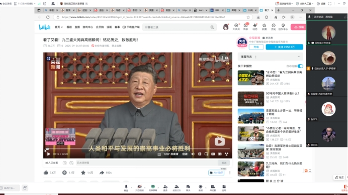 会议在庄严的团歌声中开始。全体成员共同观看了2025年“纪念中国人民抗日战争暨世界反法西斯战争胜利80周年大会”精选片段。钢铁洪流般的方阵、铿锵有力的步伐、熠熠生辉的勋章,再现了中华民族不屈不挠的抗战历程,彰显了和平与正义的伟大力量。与会青年深刻体会到抗战精神中“天下兴亡、匹夫有责”的爱国情怀和“百折不挠、坚忍不拔”的必胜信念,进一步激发了投身科研报国、勇担时代使命的坚定决心。