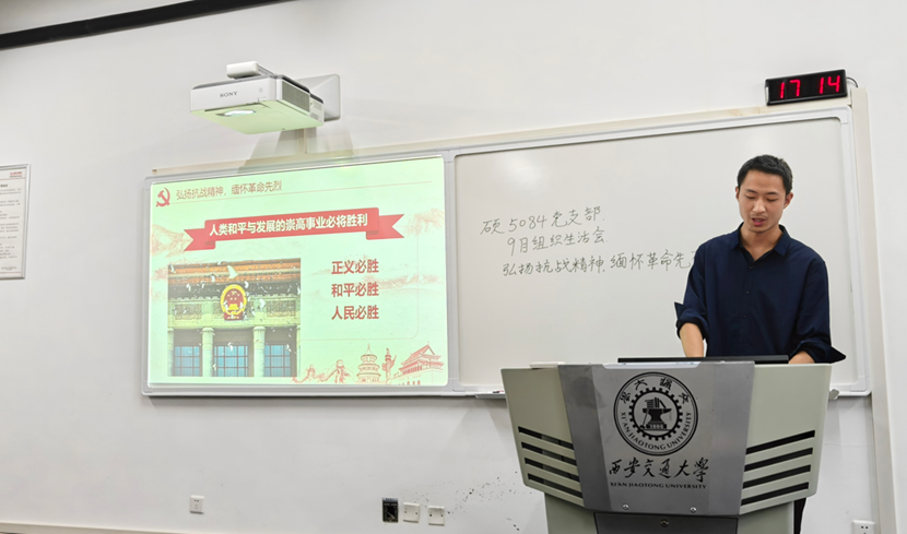 为纪念抗日战争暨世界反法西斯战争胜利80周年,弘扬抗争精神,缅怀革命先烈,硕5084党支部于9月26日在躬行楼3-3013教室举行党组织生活会。本次组织生活会由党支部书记彭百胜主持,硕5084党支部全员参与。