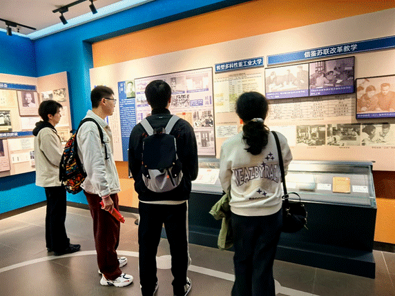 走进博物馆,序厅中巨幅西迁浮雕瞬间将大家带回那个激情燃烧的年代。讲解员详细介绍了1955年党中央、国务院作出交通大学内迁西安的重大决策背景,让团员们深刻认识到这一决策对国家工业化建设和西部发展的深远意义。在溯源厅,丰富的历史文物、图片资料清晰展现了交大从1896年南洋公学起步,历经百年风雨与国家民族命运紧密相连的发展历程,尤其是抗战时期坚持教育救国、科学救国的壮举,让团员们深感震撼。