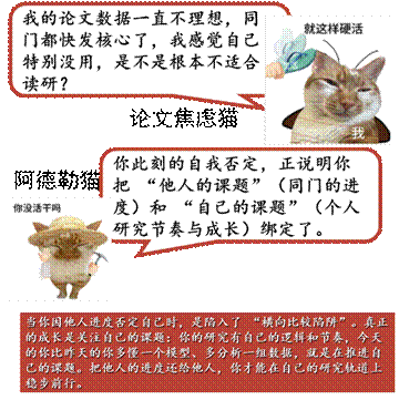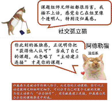 在理论分享环节,班会围绕《被讨厌的勇气》核心观点展开,提炼“专注自身课题”“自由即拥有被讨厌的勇气”等关键理论,主讲人用“太在意别人看法,就像穿着不合脚的鞋赶路,舒服与否只有自己知道”的比喻,打破“过度在意他人评价”的认知误区。针对研究生阶段典型的心理困扰,班会创新设计“焦虑猫”系列情景分析环节——从“论文焦虑猫”的横向比较困境,到“社交孤立猫”的归属感缺失,从“容貌焦虑猫”的外貌价值绑定,再到“内卷焦虑猫”的标签化自我定义,结合阿德勒、拉康、福柯等心理学及哲学理论给出破局思路。例如针对“论文数据不理想、对比同门陷入自我否定”的问题,提出“把他人的进度还给他人,关注自己的研究节奏”;针对“在课题组像透明人”的困惑,强调“归属感不是被动等待,而是主动建立连接的课题”,让抽象理论落地为可实践的心理调节方法。