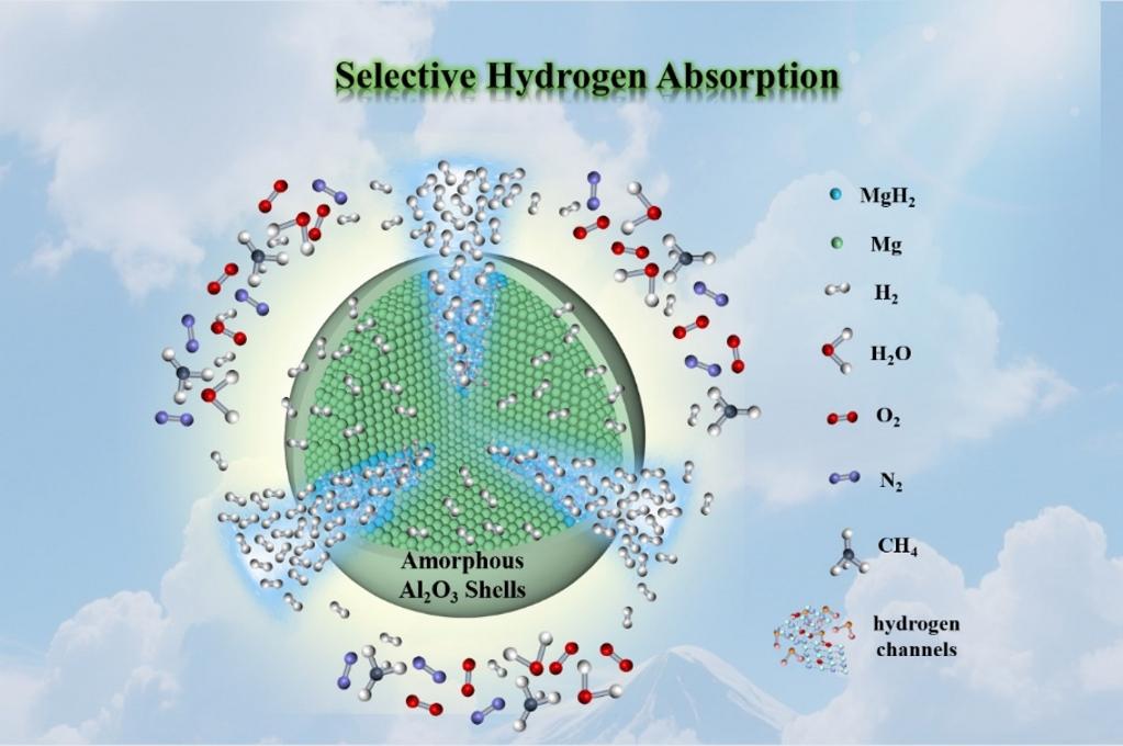 针对以上问题, 快看漫画 电工材料电气绝缘全国重点实验室张锦英教授团队通过原子层沉积技术在高活性镁基固态储氢颗粒外成功构建了纳米级非晶Al2O3封装层,在保证储氢动力学和储氢密度的基础上实现了氢气的选择性吸附。研究发现该复合体系不仅在空气暴露2个月后未水解、氧化,同时在含10% CH4(3 MPa,100℃) 、0.1%O2+0.4%N2(1.6 MPa,100℃)以及0.1%CO2+0.4%N2(1.6 MPa,100℃)的混合氢气中可实现稳定选择性吸氢。吸/放氢行为、物相转变、元素分析以及分子动力学仿真等证明复合体系水氧隔离性以及氢气选择吸附特性可归因于具有合适空隙的非晶Al2O3封装层对H2的选择渗透性以及对H2O、CH4、O2、N2以及CO2的选择阻隔性。