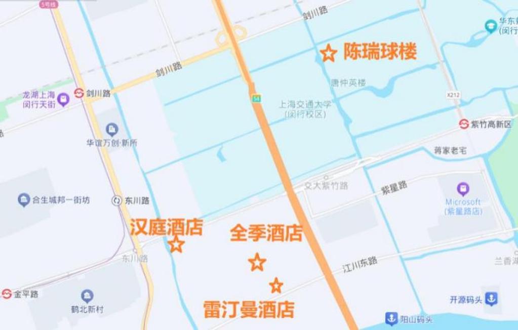 注:上海交通大学闵行校区周边还有上海白金汉爵大酒店(大零号湾国际会议 中心店)、上海紫竹万怡酒店等酒店,也可根据需要自行联系预定。